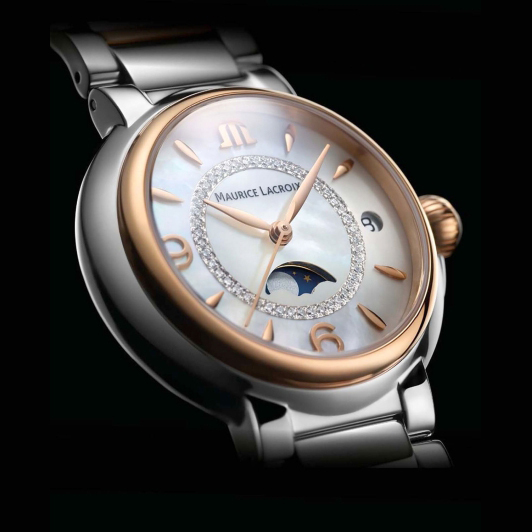 Корпус: Корпус и безель из нержавеющей стали с частичным PVD - покрытием из золота. Перламутровый циферблат украшен бриллиантами (46 штук) (? 0,80мм, SI, Wesselton, 0,124 карата). Стрелки и часовые индексы с покрытием. Выпуклое сапфировое стекло с антибликовым покрытием. Водонепроницаемость 30 метров. Размер 32 мм.