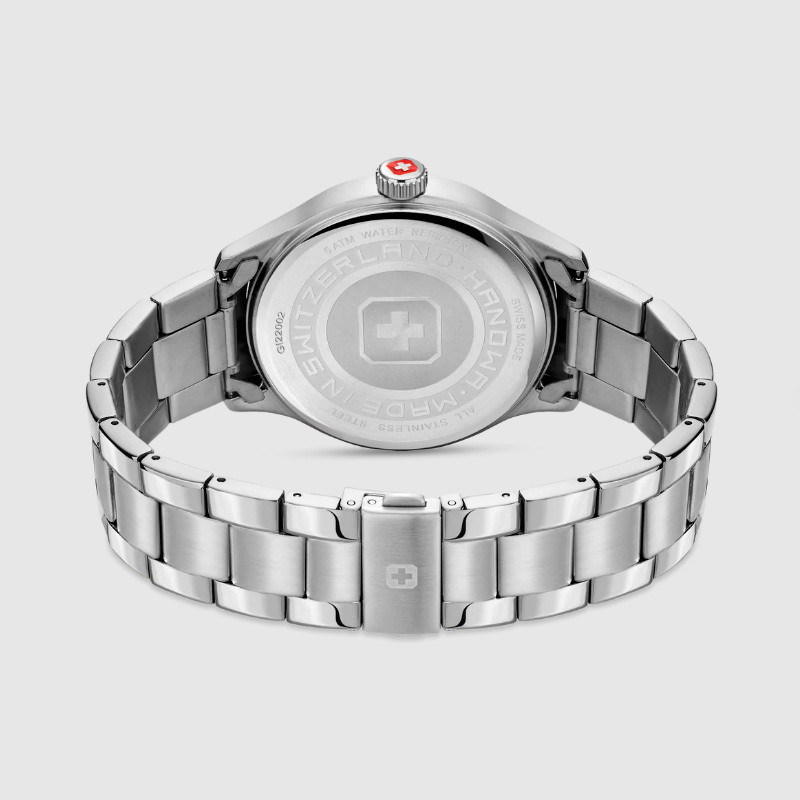 Ремешок: Стальной браслет с раскладывающейся застежкой, которая украшена фирменным логотипом.