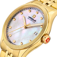 Корпус: Высококачественная нержавеющая сталь с повышенной устойчивостью к коррозии с IP покрытием. Перламутровый циферблат белого цвета. Позолоченные стрелки с люминесцентным покрытием, которое светится в темноте после непродолжительной зарядки на свету. Минеральное стекло защищает часы от повреждений. Диаметр корпуса составляет 36 мм. Водостойкость WR 50.