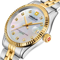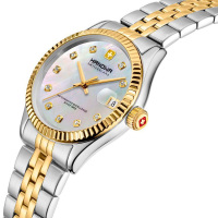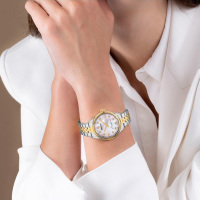 Корпус: Корпус часов изготовлен из стали 316L c частичным PVD покрытием. Перламутровый циферблат, украшен кристаллами. Стрелки и часовые индексы позолоченные. Закалённое минеральное стекло с сапфировым покрытием. Диаметр корпуса: 36 мм. Водозащита до 50 метров позволит принимать душ или умываться, не снимая часов.