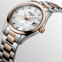 Корпус: Нержавеющая сталь марки 316L, поверхности с матовой шлифовкой сатинированием и глянцевой полировкой. Безель и заводная головка с PVD-покрытием цвета розового золота. Циферблат белый перламутровый циферблат декорирован 11 бриллиантами. Аппликация часовых индексов, а также стрелки с алмазной огранкой имеют золотое покрытие и полировку. Устойчивое к царапинам сапфировое стекло с многослойным антибликовым покрытием изнутри. Водонепроницаемость 50 метров. Диаметр 34 мм.