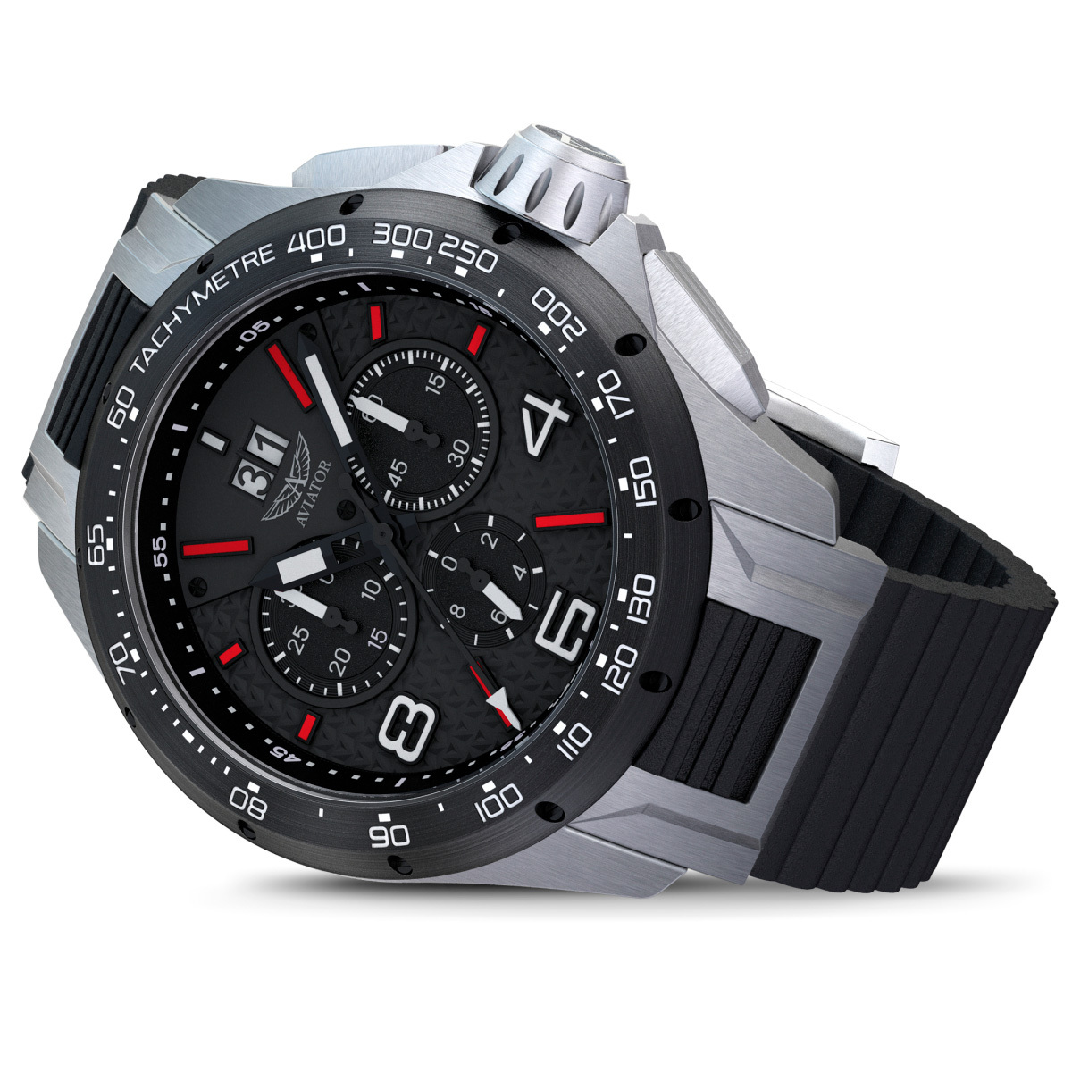 Ремешок: Ребристый ремешок напоминает трубку кислородной маски, используемой для высотных полётов. Прочный и эластичный ремешок черного цвета выполнен из полимерного материала. Литая стальная застежка с матовой шлифовкой и гравировкой Aviator.