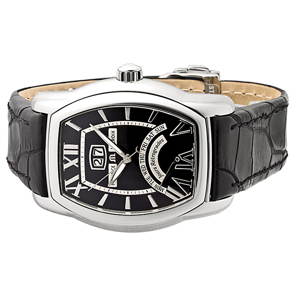 Функции: Индикация часов, минут и секунд при помощи центральных стрелок. Дата в положении 12 часов в стиле "большая дата". Ретроградный указатель дня недели в положении 6 часов.