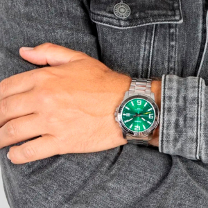 Корпус: Корпус часов выполнен из гипоаллергенной латуни с хромированным покрытием. Циферблат выполнен по технологии Sunray (солнечные лучи) зеленого цвета. Часовые индексы в виде штрихов и цифр. Необритовое светонакопительное покрытие, нанесенное на стрелки и индексы, обеспечивает длительное послесвечение в темноте даже после кратковременного нахождения на свету. Минеральное стекло защищает циферблат от повреждений. Габаритные размеры: 45x49мм, толщина 10,3мм. Водозащита: 5 ATM.