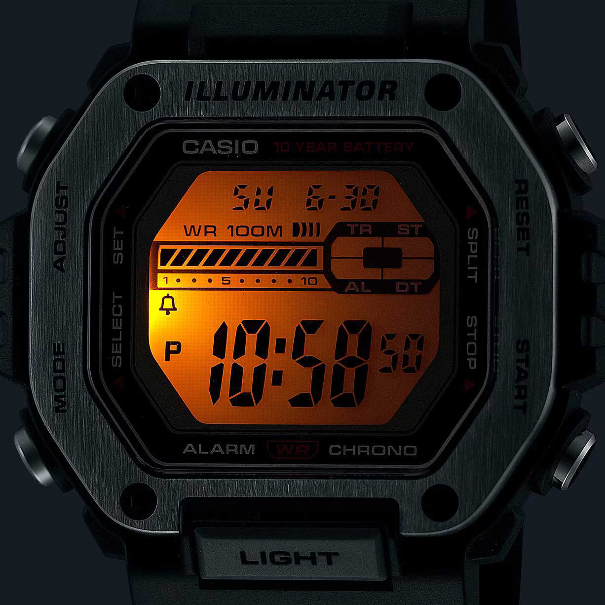 Функции: Светодиодная подсветка. На циферблате отображается текущее число, месяц и день недели. Функция секундомера- 1/100 сек. - 24 часа. Функция будильника. После настройки автоматический календарь всегда отображает точную дату. Отображение времени возможно в 12-часовом или 24-часовом формате. Таймер - 1/1 сек. - 24 часа (с автоматическим повтором). Второй часовой пояс.