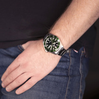 Корпус: Корпус этих часов выполнен из нержавеющей стали. Минеральное стекло. Зелёный циферблат. Рифленый вращающийся безель с минутной шкалой. Широкие мечевидные стрелки в стиле Sword. Метки и стрелки с люминесцентным покрытием, которое светится в темноте после непродолжительной зарядки на свету.Водоустойчивость: 200 метров. Диаметр 44 мм.