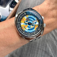 Корпус: Корпус из высококачественного стального сплава с высокими антикоррозийными свойствами. Циферблат разноцветный с серебристыми стрелками и метками в виде точек. Минеральное стекло крайне устойчиво к повреждениям. Диаметр корпуса: 44 мм. Толщина: 14 мм. Водонепроницаемость: 200 м.