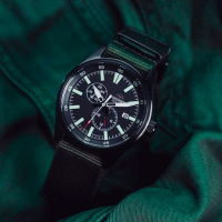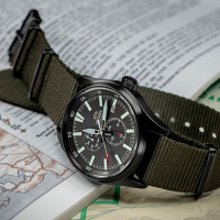 Корпус: Нержавеющая матовая сталь с PVD покрытием чёрного цвета. Тёмный циферблат. Фотолюминесцентный состав на стрелках и на разметке циферблата. Минеральное стекло. Заводная головка с защитой. Завинчивающаяся задняя крышка. Диаметр 42 мм. Водонепроницаемисть 100 м.