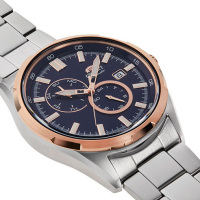 Корпус: Корпус из нержавеющей стали с IP покрытием цвета розового золота по безелю. Циферблат синего цвета. Стрелки и метки в виде штрихов с покрытием цвета розового золота. Минеральное стекло устойчиво к повреждениям. Завинчивающаяся заводная головка и задняя крышка. Вращающийся однонаправленный безель. Завинчивающаяся задняя крышка и заводная головка. Диаметр корпуса: 42,8 мм. Толщина: 13,1 мм. Водонепроницаемость: 200 м.