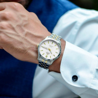 Корпус: Круглый корпус выполнен из матовой/полированной нержавеющей стали. Светлый циферблат. Золотистые cтрелки покрыты люминесцентным составом SuperLuminova. Прочное минеральное стекло. Диаметр корпуса составляет: 43 мм. Водозащита: 50 м.
