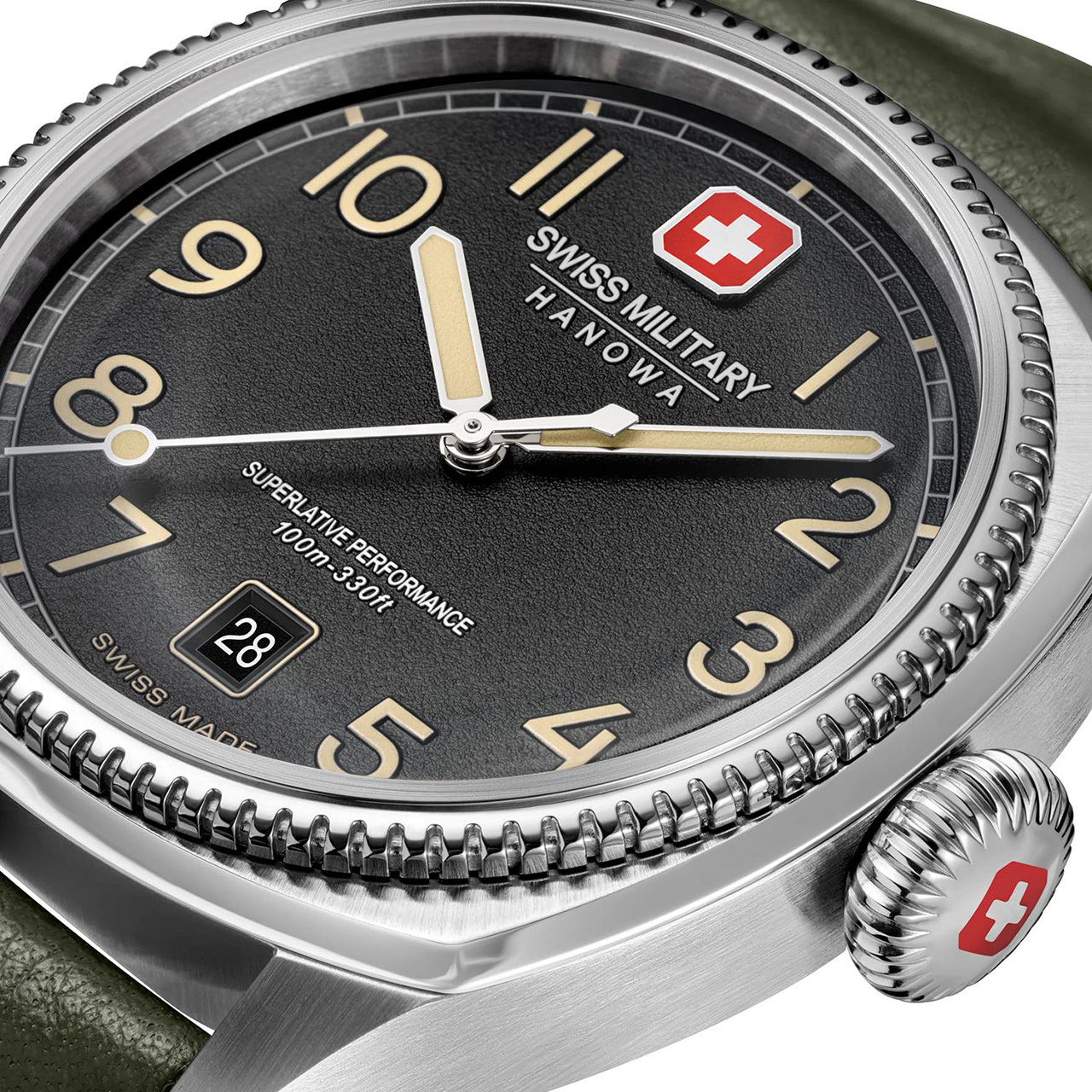Корпус: Стальной винтажный корпус с шлифованным модифицированным безелем с плоским ребристым краем в виде монеты. Циферблат с пескоструйной отделкой дополнен фирменным логотипом Swiss Military Hanowa. Накладные метки в виде арабских цифр. Заостренные прямоугольные стрелки в стиле Baton. Метки и стрелки с люминесцентным покрытием, которое светится в темноте после непродолжительной зарядки на свету. Сапфировое стекло устойчивое к появлению царапин, обладающее высокой прозрачностью. Рифленая заводная головка в пилотском стиле, украшена фирменным логотипом. Завинчивающаяся задняя крышка. Диаметр 41 мм. Водонепроницаемость 100 м.