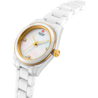Корпус: Круглый корпус из керамики белого цвета, вставки из стали с IP покрытием. Белый перламутровый циферблат, украшен тремя искусственными бриллиантами. Позолоченные стрелки с люминесцентным покрытием, которое светится в темноте после непродолжительной зарядки на свету. Сапфировое стекло устойчивое к появлению царапин, обладающее высокой прозрачностью. Диаметр: 31,5 мм. Водонепроницаемость: 50 м.