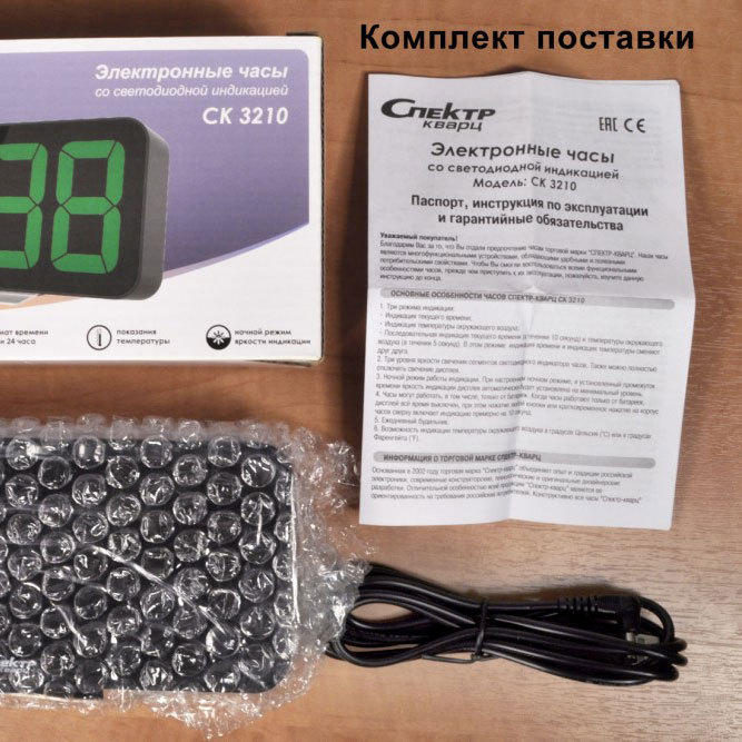 Механизм: Часы настольные с цифровой индикацией с будильником и измерением температуры. Яркость свечения часов можно менять (три уровня яркости) или полностью отключить индикацию. В режиме выключенной индикации нажатие любой кнопки кратковременно включит индикацию. Также у часов есть ночной режим работы индикации, который позволяет автоматически снизить яркость свечения в тёмное время суток. При включённом ночном режиме, в настроенный промежуток времени яркость индикации дисплея автоматически будет установлена на минимальный уровень. Часы могут работать в трёх режимах: отображение текущего времени, отображение температуры окружающего воздуха и режим попеременного отображения времени и температуры. Две центральные точки на дисплее часов не мигают. Часы могут работать, в том числе, только от батареек, т.е. без подключения к внешнему источнику питания. Когда часы работают только от батареек, дисплей всё время выключен, при этом нажатие любой кнопки или кратковременное нажатие на корпус часов сверху включит индикацию примерно на 10 секунд. У часов есть один будильник. Температура может показываться в градусах Цельсия или в градусах Фаренгейта. Питание осуществляется от порта USB. В комплекте с часами идёт USB шнур (1,5 метра) для питания часов от USB источника (5V). Для питания можно использовать, например, любой адаптер, предназначенный для зарядки мобильных телефонов, и имеющий USB выход. Блока питания от сети 220V в комплекте нет.