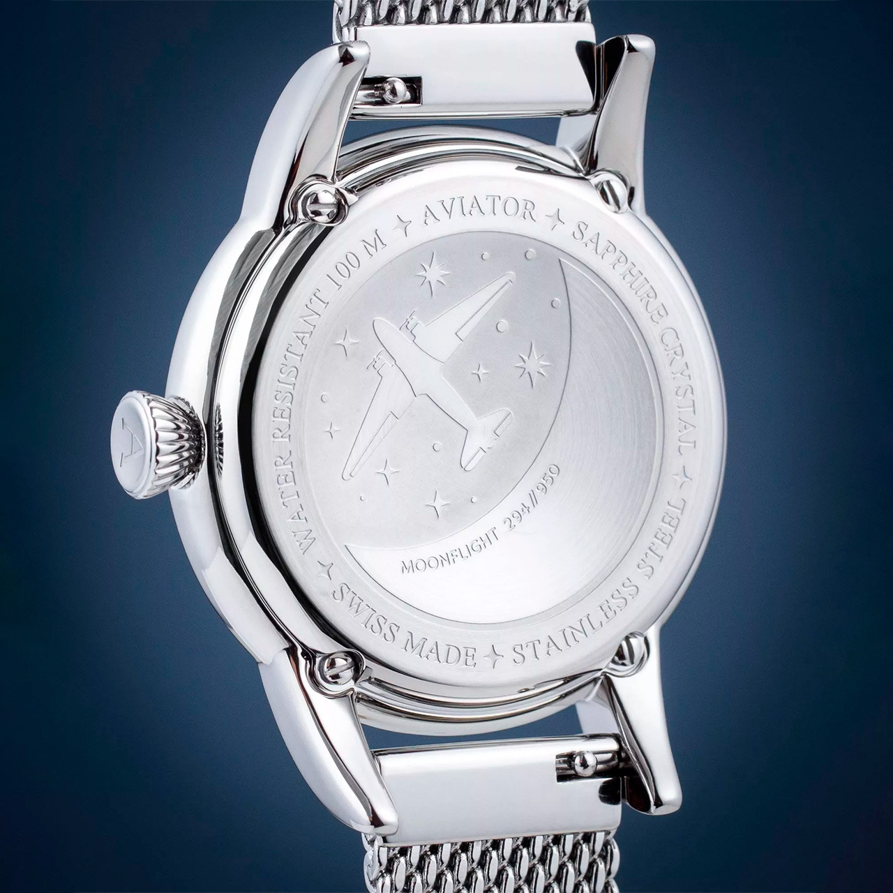 Корпус: Корпус круглой формы выполнен из нержавеющей стали марки 316L. Циферблат чёрного цвета с различными видами финишной обработки. В центральной части стилизация под гильоширование, окруженная шлифовкой в стиле «солнечные лучи». Аппликация часовых индексов и меток-точек. Облака рядом с индикатором фаз Луны с инкрустацией перламутром. Сапфировое стекло с двусторонним антибликовым покрытием имеет повышенную устойчивость к возникновению царапин. Задняя крышка с гравированным изображением авиалайнера Douglas DC-3 имеет винтовое соединение с корпусом. Диаметр: 36 мм. Водостойкость 100 метров (10 АТМ).