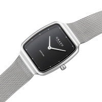 Ремешок: Стильный браслет из нержавеющей стали, выполненный в технике миланского плетения, подчеркивает утонченность дизайна и обеспечивает надежную фиксацию на руке благодаря удобной раскладной застежке. Застежка с системой блокировки.