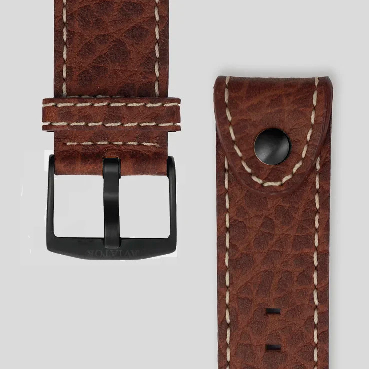 Ремешок: Коричневый ремешок из износостойкой бычьей кожи высшего качества с неповторимым рисунком. Нестандартное решение: крепление ремешка с помощью кнопок, как это делалось в ранних наручных часах.