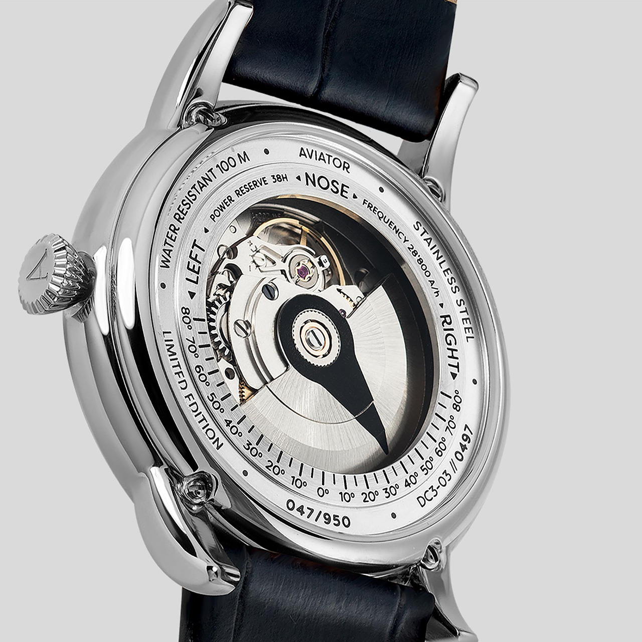 Корпус: Нержавеющая сталь марки 316L. Циферблат серебристого цвета. Стрелки и часовые индексы покрыты люминесцентным составом SuperLuminova. Сапфировое стекло с антибликовым покрытием. Переводная коронка с двойным уплотнителем для дополнительной защиты. Задняя крышка с прозрачным окном из сапфирового стекла имеет винтовое соединение с корпусом. В оформлении задней крышки использована стилизация под один из инструментов управления из кабины самолета Douglas DC-3. Гравировка с градусами на крышке корпуса и стрелка на роторе автоподзавода имитируют функцию угла перекладки руля, которая контролирует положение передней и задней частей самолета. Водонепроницаемость 100 метров. Диаметр 45 мм.