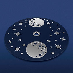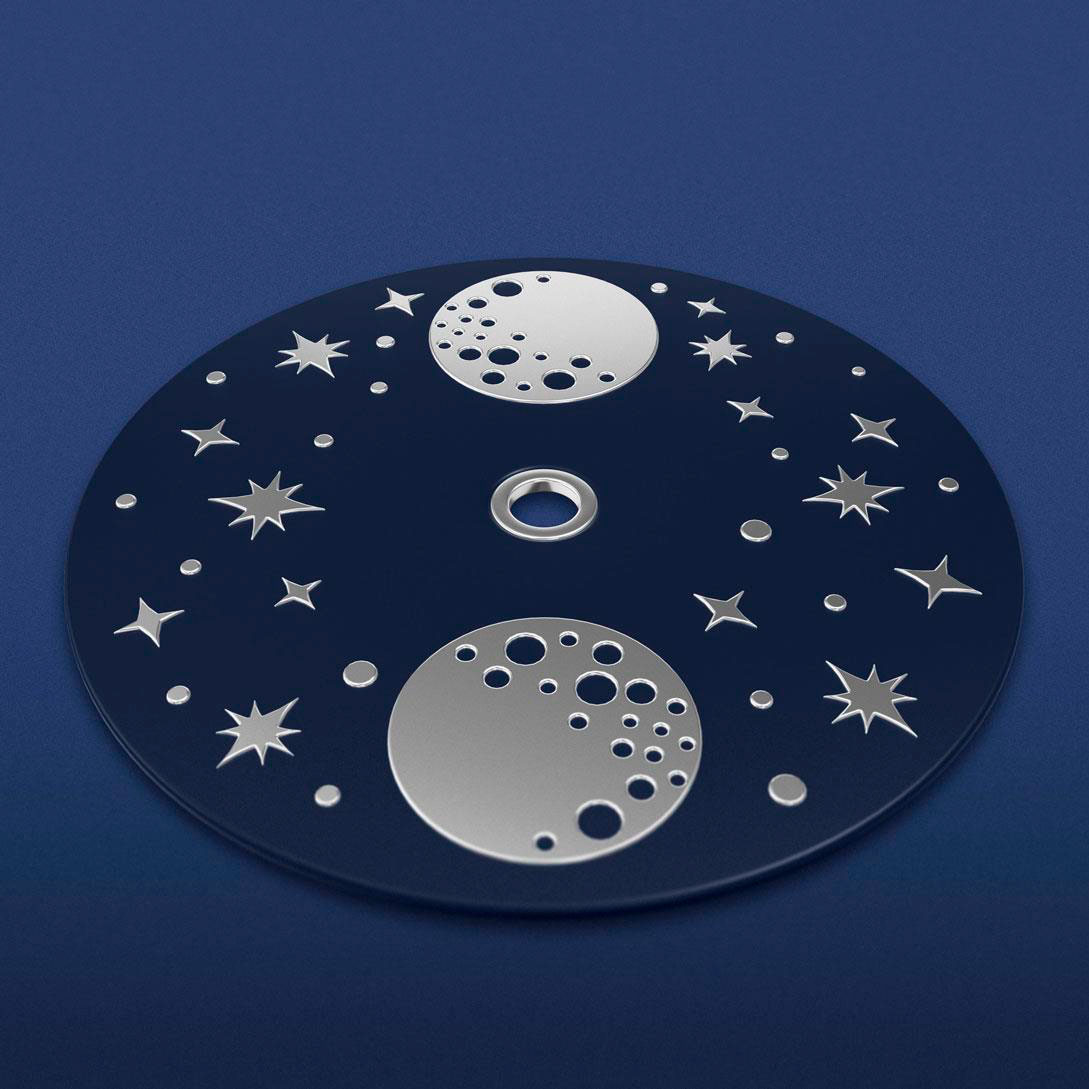 Циферблат представляет собой вершину моды и философии дизайна в стиле ар-деко. Интенсивная отделка солнечными лучами, бриллиантовые индексы и подлинный перламутр создают мягкий, но таинственный, смелый, но сложный ансамбль. Циферблат ﹘фазовый диск Луны обрамлен слоем облаков, гильошированным отделкой и дизайном восприятия глубины(3D), чтобы затеряться на горизонте. А изящно отполированные заклепки вдоль крошечного железнодорожного пути отсылают к самолетам из золотого века авиации.