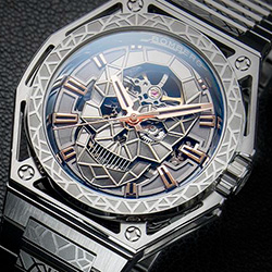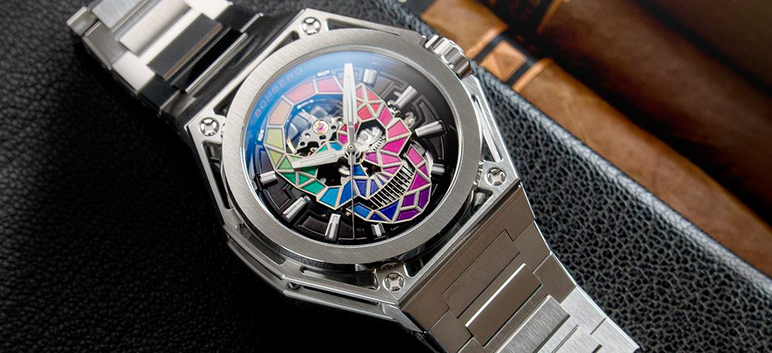 - Циферблат: Скелетонизированный, череп из цветных сегментов.