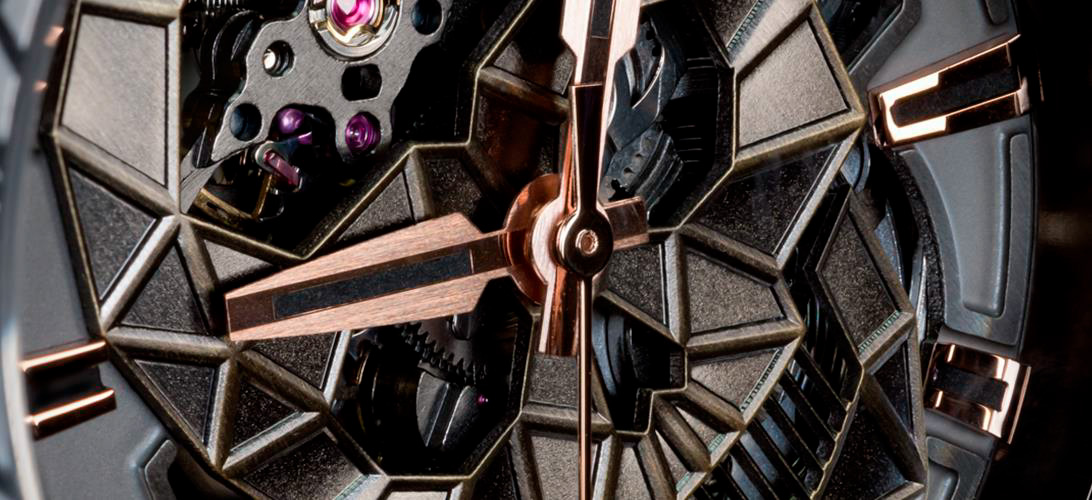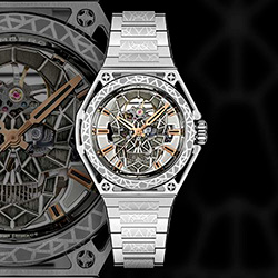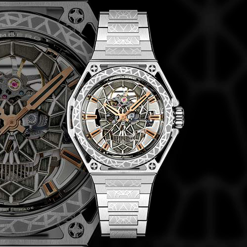 Главный визуальный элемент - это 3D-скелетонизированный череп на циферблате, выполненный в технике многослойного оформления. Этот эффект напоминает витражное искусство , создавая динамичный и выразительный облик. В центре циферблата, на уровне 12 часов , можно увидеть колесо баланса , которое напоминает бьющееся сердце механизма.