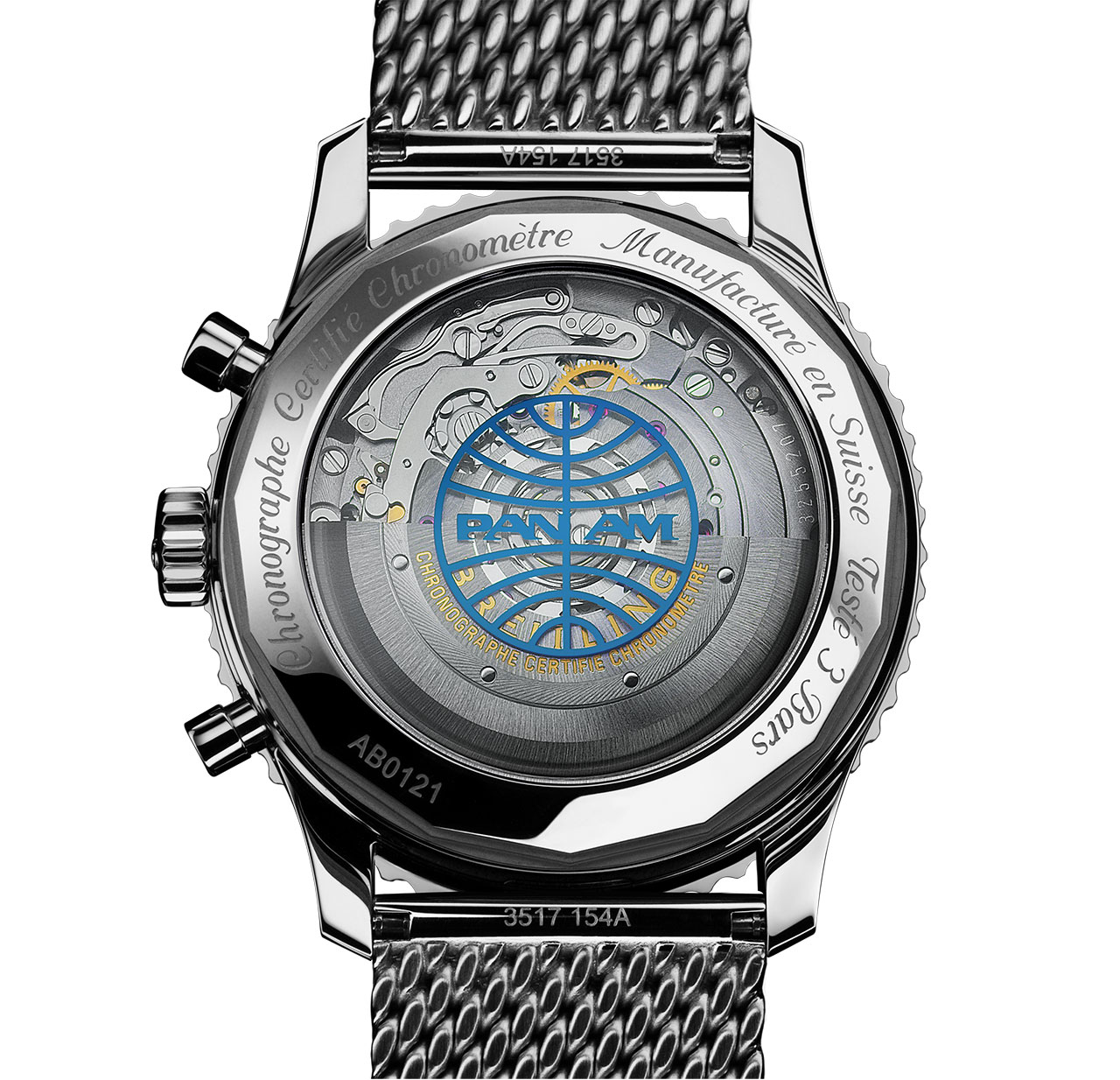 Официально лицензированная модель Navitimer 1 B01 Chronograph 43 Pan Am Edition отличается одним из самых узнаваемых логотипов в истории авиации. Он нанесен на прозрачную заднюю крышку корпуса из сапфирового стекла. На протяжении десятилетий авиакомпания Pan American World Airways являлась лидером гражданской авиации. И даже сейчас, когда авиакомпания прекратила свою деятельность, это имя вызывает волнующие воспоминания о воздушном путешествии. Модель Pan Am Edition имеет корпус из нержавеющей стали с синим циферблатом, серебристыми дополнительными циферблатами, коричневым кожаным ремешком в винтажном стиле, браслетом Breitling Air Racer или плетеным браслетом из нержавеющей стали. Модель Pan Am Edition стала второй моделью капсульной коллекции Breitling.