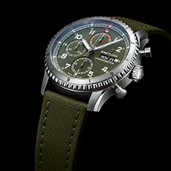 Хронометр, сертифицированный Швейцарским институтом официального тестирования хронометров (COSC), имеет корпус из нержавеющей стали диаметром 43 мм и ремешком цвета хаки. Водонепроницаемость часов – до 10 бар (100 м).
