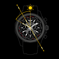 Циферблат часов «Breitling Bentley B05 Unitime Midnight Carbon» можно использовать в качестве солнечного компаса для определения сторон горизонта, при этом в регионах, используемых летнее время, необходимо учитывать поправку времени на один час.