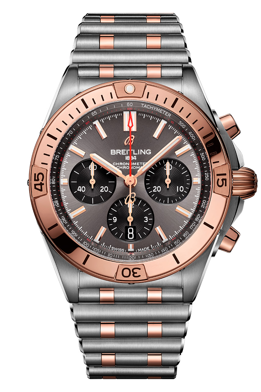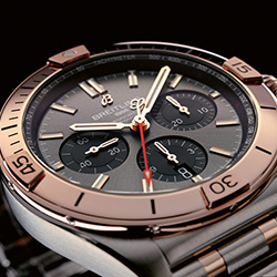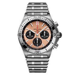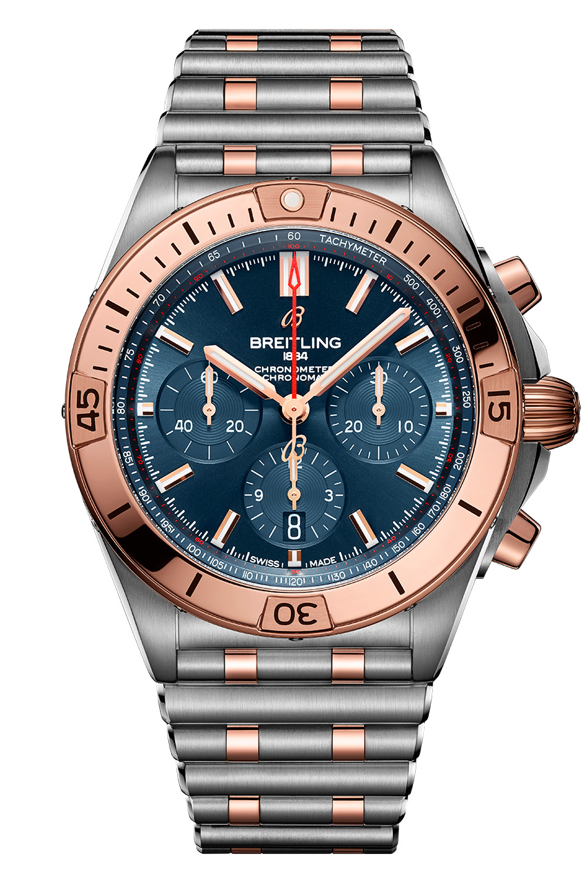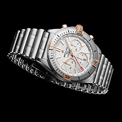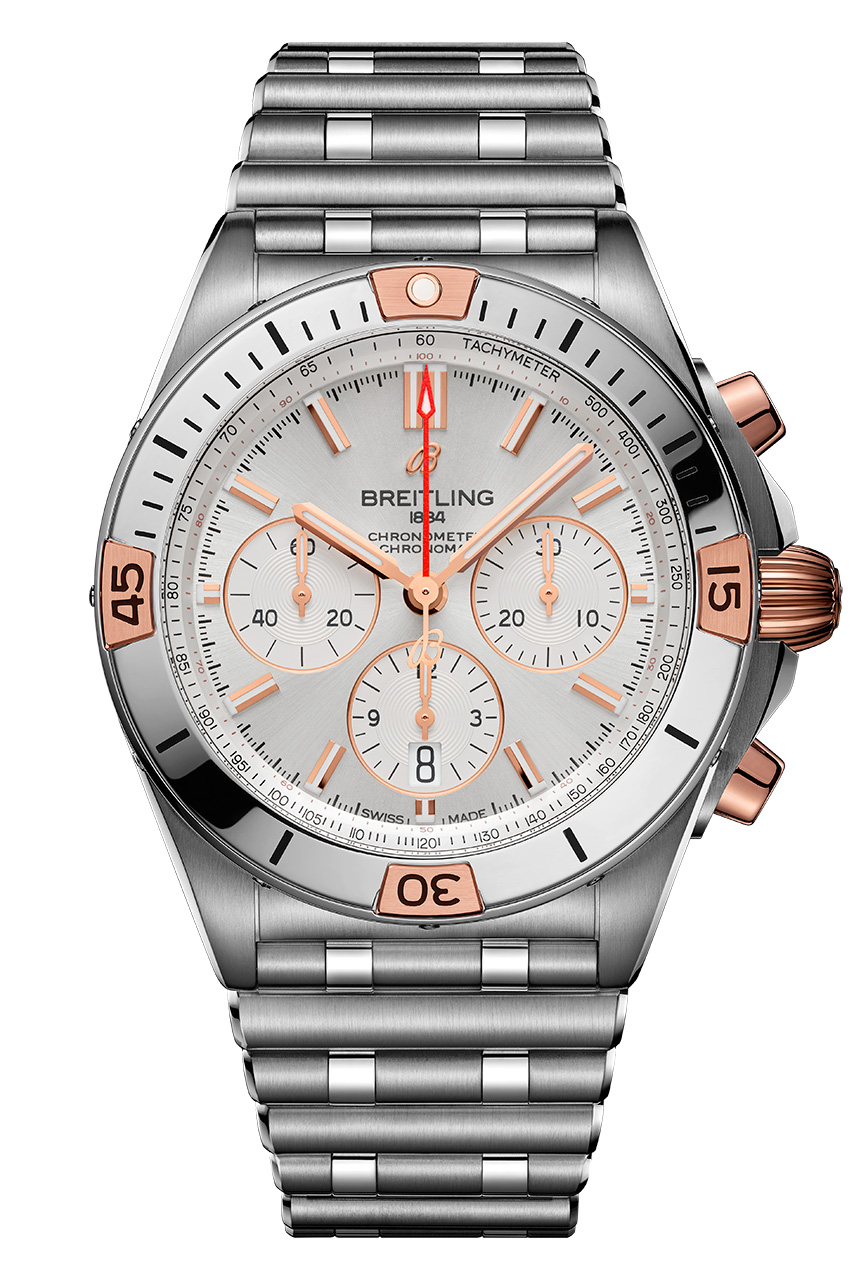 Ценители роскоши не оставят без внимания Chronomat B01 42, оснащенные заводной головкой и кнопками из 18-каратного розового золота, а также безелем с райдерами, цифрами и индексами из 18-каратного розового золота. Часы отличаются серебристым циферблатом с дополнительными циферблатами в тон основному, а также 42-миллиметровым корпусом из нержавеющей стали. Они дополнены браслетом Rouleaux из нержавеющей стали с клипсой.