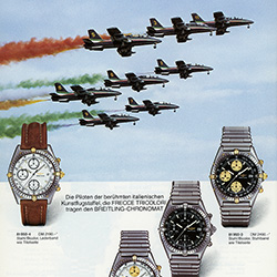 Появление этих часов в 1984 году стало возрождением эпохи культовых механических швейцарских часов, которые во времена кварцевого кризиса 1970-х практически исчезли с мировой арены. Chronomat был вдохновен часами Frecce Tricolori 1983 года, выпущенных в рамках сотрудничества с пилотажной группой ВВС Италии. Они удивительно точно подчеркнули многогранную столетнюю историю Breitling и ознаменовали возвращение механического хронографа в модельный ряд легендарного бренда. Благодаря сочетанию технических характеристик и ярких дизайнерских решений харизматичные спортивные часы Chronomat стали моделью своей эпохи, воплощением эстетики и надежности, свойственным настоящему хронографу.