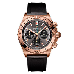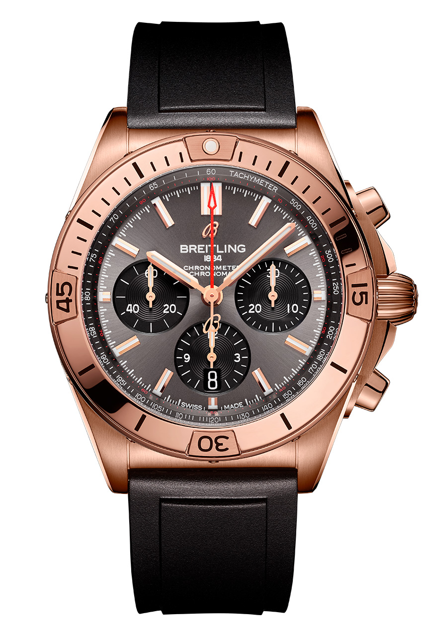 Для ценителей спорта и роскоши прекрасно подойдет модель Chronomat B01 42 в ярком корпусе из 18-каратного розового золота, дополненная черным каучуковым ремешком с раскладной застежкой из 18-каратного розового золота. Часы обладают циферблатом антрацитового цвета с контрастными счетчиками хронографа.