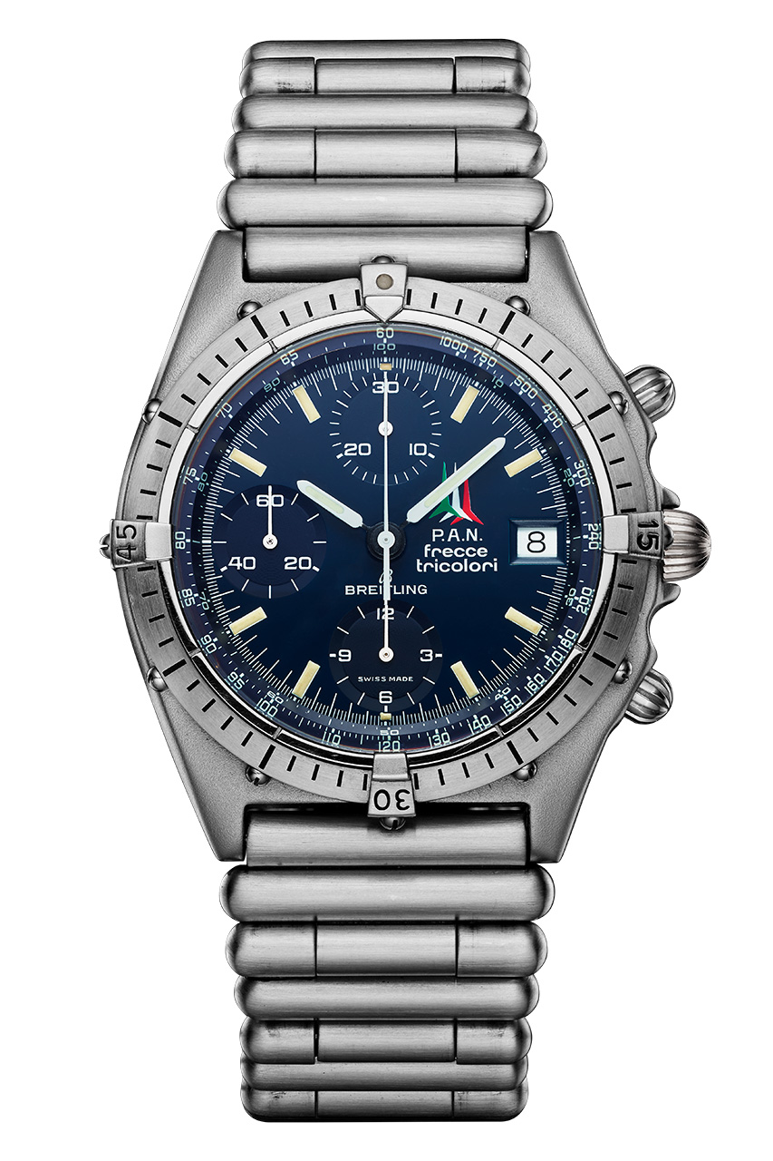 Именно часы Frecce Tricolori 1983 года вдохновили часовых мастеров Breitling на создание модели Chronomat, приуроченной к столетнему юбилею бренда. Новые Chronomat Frecce Tricolori Limited Edition обладают синим циферблатом и дополнительными циферблатами в тон основному. Кроме того, циферблат часов украшен логотипом Frecce Tricolori, размещенным на месте фирменного логотипа часового бренда. Часы, посвященные легендарной пилотажной группе, представлены в лимитированной серии из 250 экземпляров и украшены гравировкой «ONE OF 250» на задней крышке корпуса. Все часы дополнены браслетом Rouleaux из нержавеющей стали с клипсой.