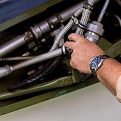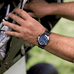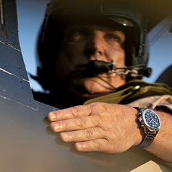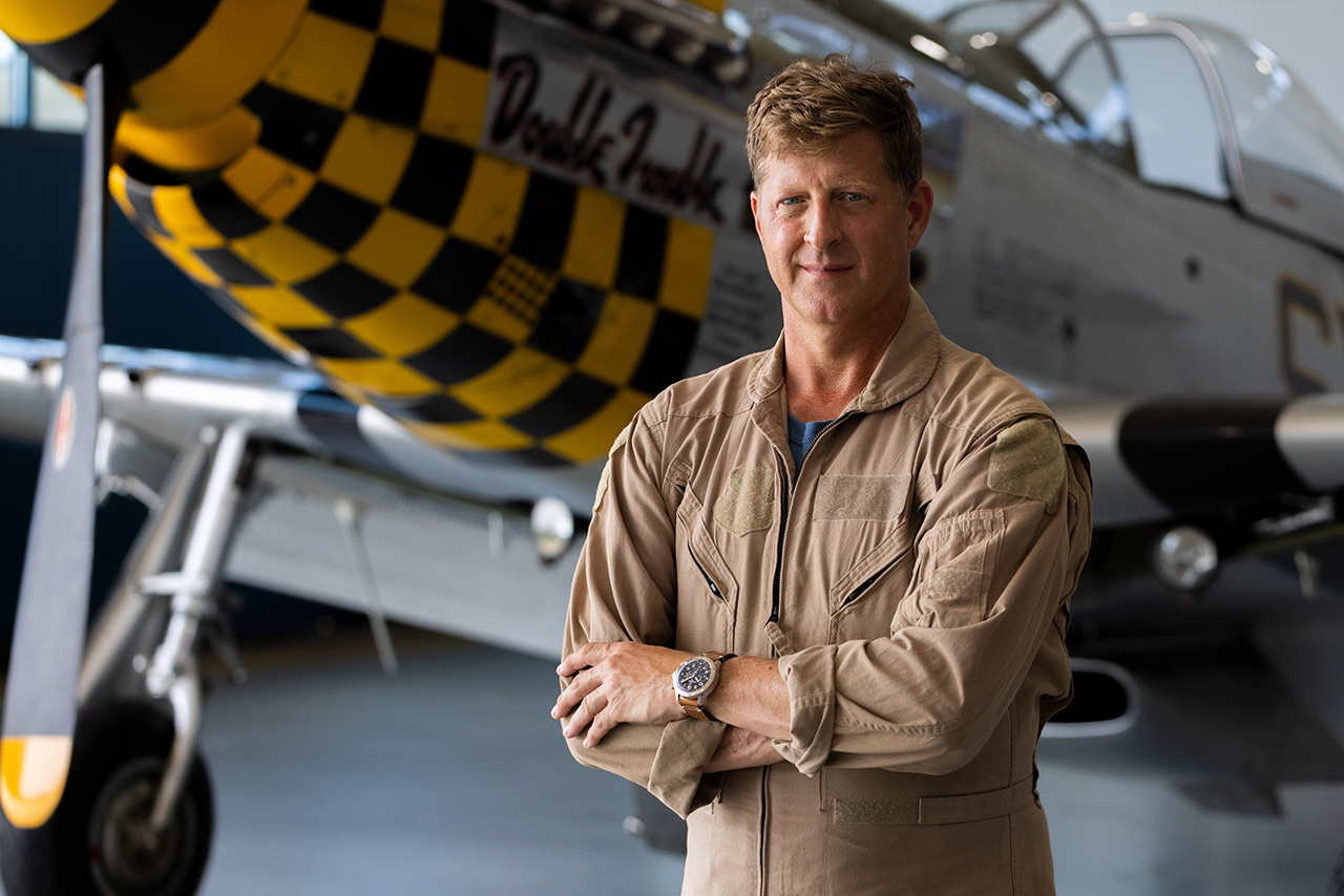 На P-51 Mustang летал Рэй Фоулер с моделью часов Super AVI P-51 Mustang на запястье. P-51 Mustang был спроектирован и произведен всего за 120 дней. И на тот момент даже его разработчик – компания North American Aviation – еще не осознавал, насколько мощной получилась эта машина. Крыло с низким аэродинамическим сопротивлением и система охлаждения двигателя P-51 (на момент первого вылета в 1940 году она считалась экспериментальной) обеспечили этому одноместному истребителю беспрецедентную скорость и дальность полета. Переход на двигатели Merlin позволил увеличить высотные характеристики самолета, сделав его лучшим многоцелевым истребителем своего времени.