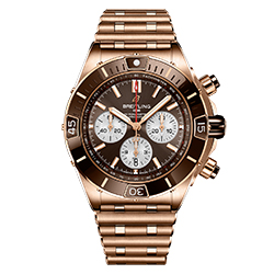 Часы Super Chronomat B01 44 выполнены в трех вариантах. Два – в корпусе из нержавеющей стали с черным или синим цветом циферблата и безеля. Третий вариант модели сочетает в себе насыщенный коричневый оттенок циферблата и безеля и корпус из 18-каратного красного золота. Все экземпляры часов оснащены контрастными серебристыми счетчиками хронографа и мануфактурным калибром Breitling 01, сертифицированным Швейцарским институтом официального тестирования хронометров (COSC) и обладающим запасом хода около 70 часов. Водонепроницаемость этой модели Super Chronomat составляет до 200 метров.