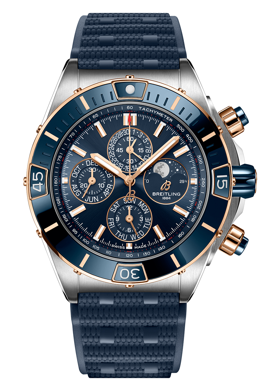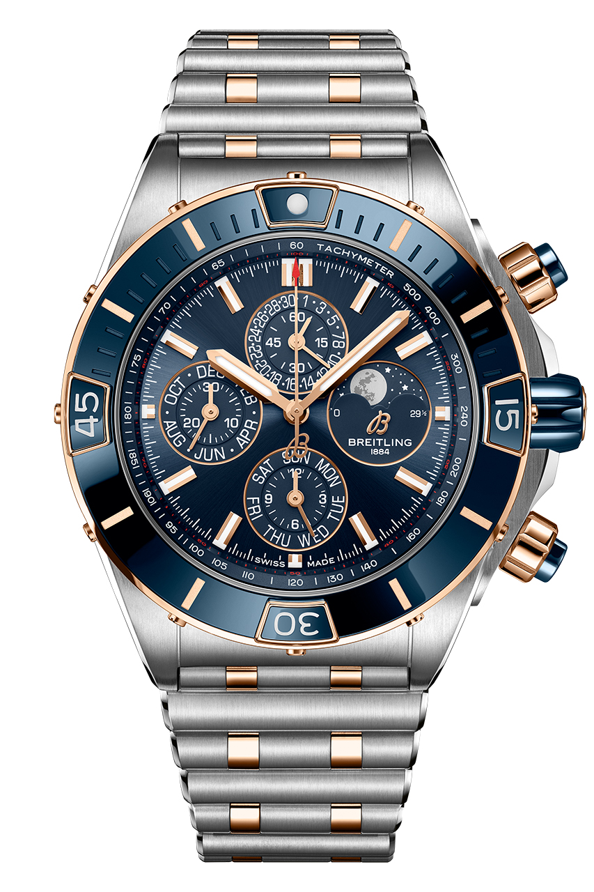 Как следует из названия модели Super Chronomat 44 Four-Year Calendar, она обладает механизмом календаря, который нужно корректировать лишь один раз каждый високосный год, или раз в 1461 день. Часы представлены в двух вариантах: с черным циферблатом и счетчиками хронографа того же оттенка, безелем из нержавеющей стали с инкрустацией из черной керамики и элементами из 18-каратного красного золота или с синим циферблатом, счетчиками хронографа того же оттенка и безелем из 18-каратного красного золота с инкрустацией из синей керамики. Модель обладает водонепроницаемостью до 100 метров, часовым механизмом хронографа Breitling 19, сертифицированным COSC, и полувечным календарем с индикаторами дня, даты, месяца и фаз Луны.