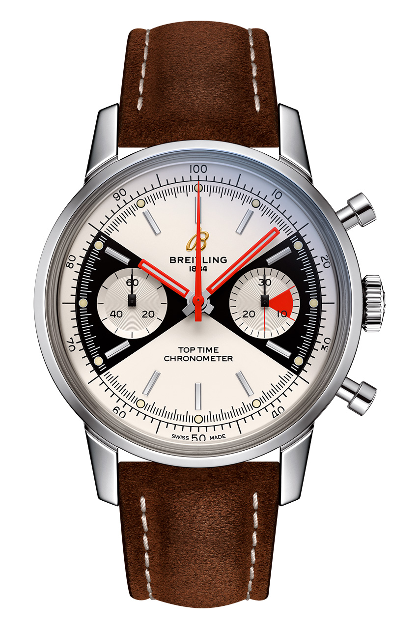 Сегодняшняя новинка от Breitling является обновленной версией модели Top Time, выпущенной более полувека назад. Как и исторический прототип, новый хронограф отличается необычным дизайном, подчеркивающим его яркую индивидуальность. Взглянув на циферблат, который в среде коллекционеров и знатоков получил название Zorro, понимаешь, что владелец таких часов не лишен здоровой доли самоиронии. Однако на этом шутки заканчиваются – под обманчивой игривостью прячется хронограф с серьезными характеристиками, типичными для часов Breitling.