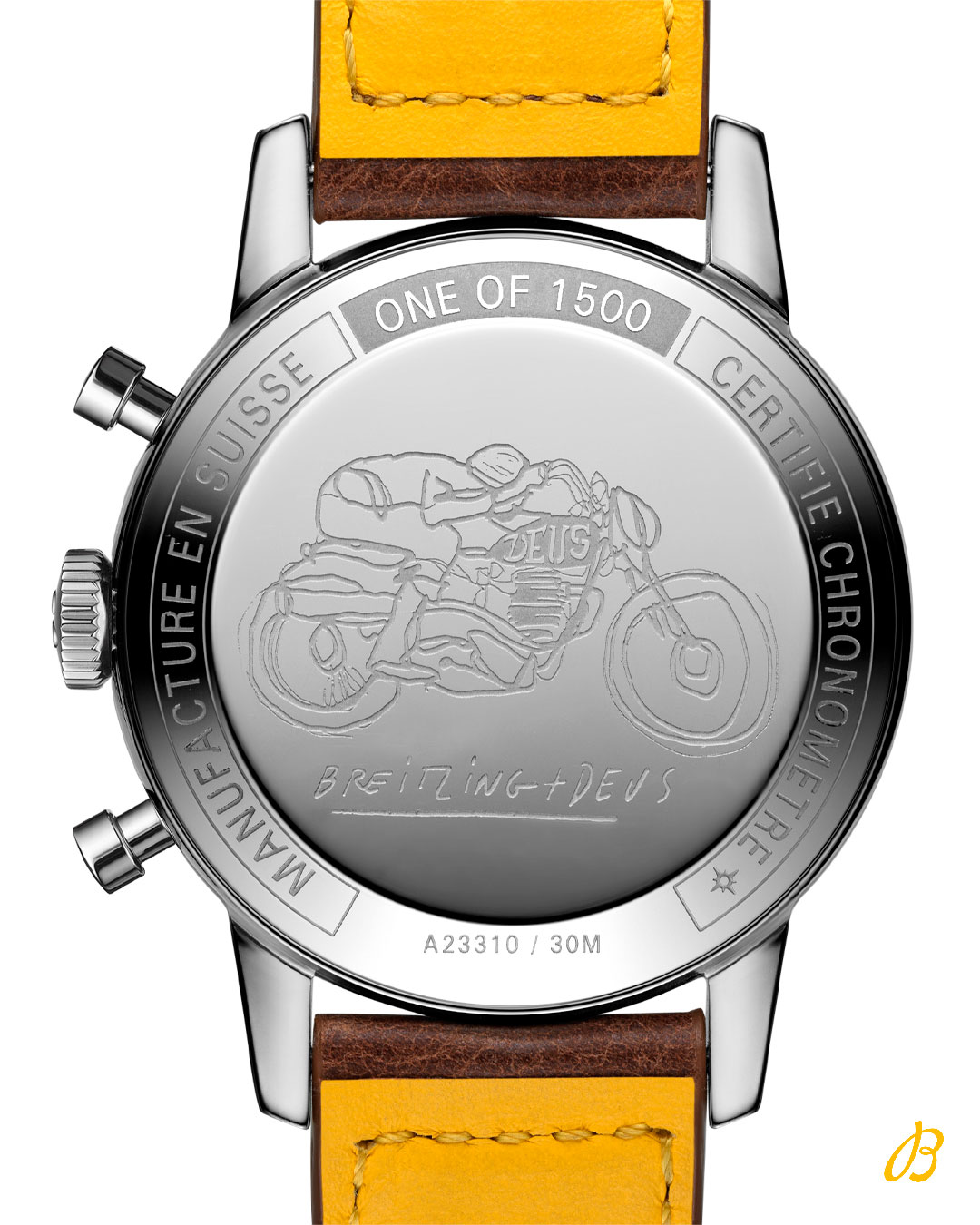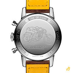 Хронограф Top Time Deus, разработанный в сотрудничестве с компанией Deus Ex Machina, напоминает оригинальную модель Breitling 60-х годов, которая передает искреннее восхищение духом кочевников. Первые часы Top Time создавались как ультрасовременные хронографы для молодых и активных профессионалов. В современной серии воспроизводится стиль ретро – он неизменно популярен. С таким спутником на запястье можно смело отправляться навстречу приключениям. Стильная и смелая – новая версия хронографа оснащена ремешком из телячьей кожи для поклонников гонок. На серебристом циферблате с желтыми и оранжевыми акцентами расположены счетчики хронографа в форме квадрокруга, а также логотип Deus и его слоган «In benzin veritas», нанесенный белым цветом на черной тахиметрической шкале. На обратной стороне корпуса из нержавеющей стали диаметром 41 мм нанесено изображение с культового постера Deus, мчащийся на полной скорости мотоциклист в стиле ретро. Его автор креативный директор Deus Керби Такуэлл. Часы оснащены механизмом Breitling Caliber 23, сертифицированным Швейцарским институтом официального тестирования хронометров (COSC) и имеющим запас хода около 48 часов.
