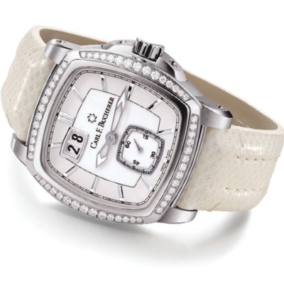 Это, например и белый или тёмный циферблат с перламутровой вставкой и с 56 бриллиантам на ранте. Кроме того дамская модель может снабжаться различными ремешками: из кожи питона, лакированной телячьей кожи, кожи водяной змеи или кожи аллигатора.