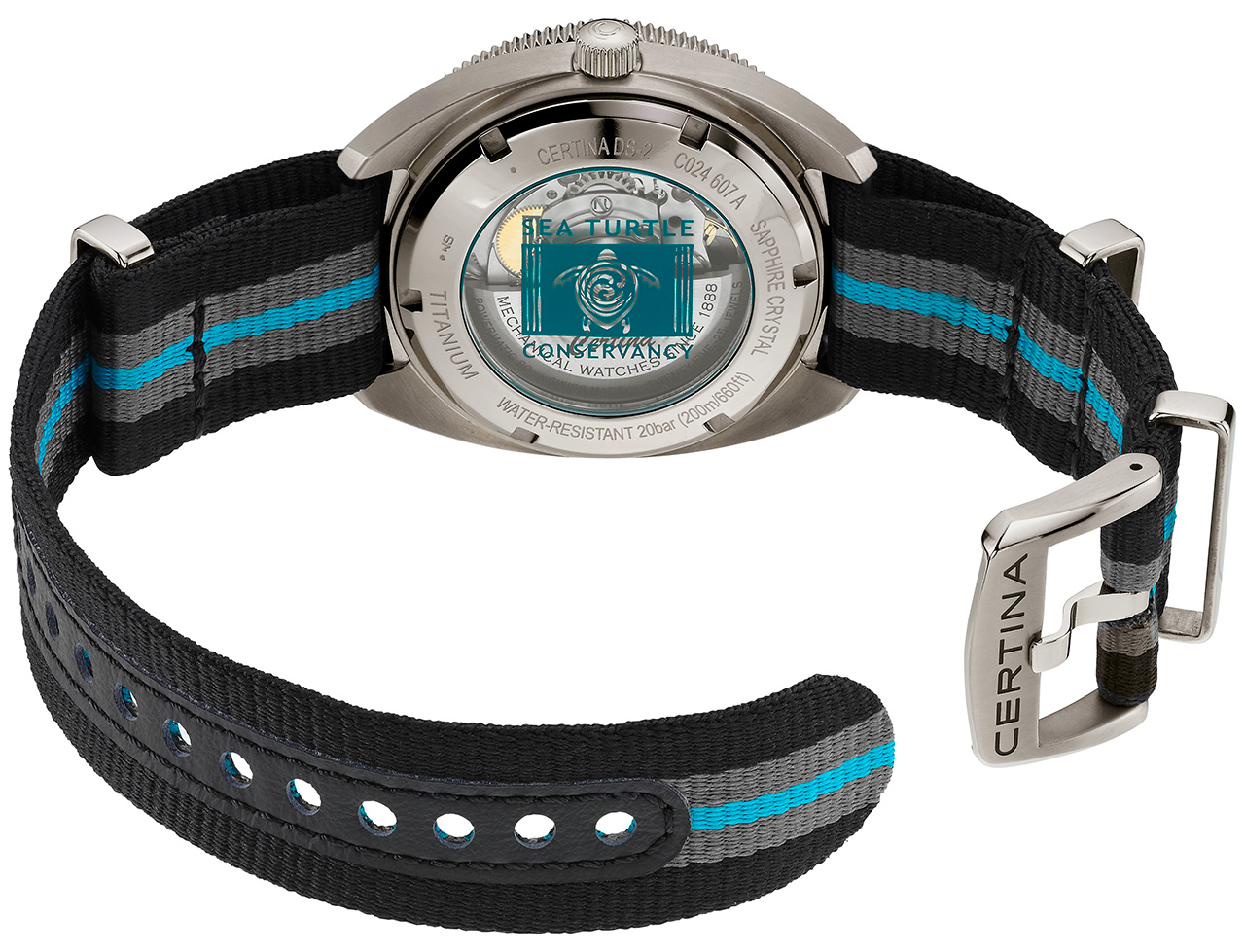 Благодаря вращающемуся в одном направлении безелю повышенной водонепроницаемости и ремешку из материала #tide Ocean Material® часы DS-2 прочно связаны с водным миром. В особенности это справедливо для данной специальной серии: часть вырученных от продажи средств передается Sea Turtle Conservancy. Эта некоммерческая организация уже несколько десятилетий предпринимает меры по защите морских черепах и мест их обитания – достойное дело, которое Certina поддерживала на протяжении многих лет.