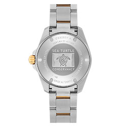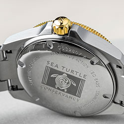 Завинчивающаяся задняя крышка корпуса украшена рельефным логотипом Sea Turtle Conservancy в виде черепахи. Внутри корпуса находится современный часовой механизм Powermatic с запасом хода до 80 часов и инновационной пружиной баланса из материала NivachronTM. Этот высокоэффективный материал не подвержен воздействию магнитных полей и обеспечивает безупречную точность хода часов в любых условиях. Часы дополнены браслетом из нержавеющей стали с высококачественным PVD-покрытием цвета желтого золота с раскладывающейся застежкой, оснащенной интегрированным удлинением для дайвинга.