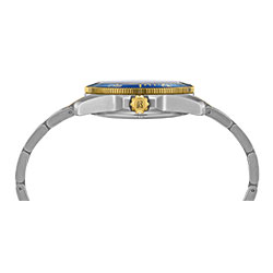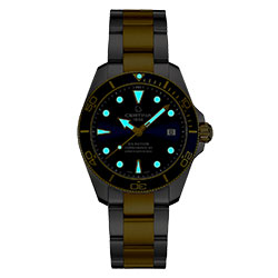 - Однонаправленно вращающийся алюминиевый безель синего цвета с золотистыми отметками с PVD-покрытием и покрытием Super-LumiNova®.