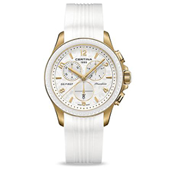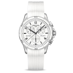 1. Модель «Certina DS First Lady Ceramic – Chronograph» C030.217.17.017.00 Стальной корпус, плоский безель из белой керамики, белый циферблат, центральные стрелки, стрелки счётчиков хронографа, условные индексы и арабские цифры чёрного цвета, каучуковый ремешок белого цвета. | |