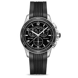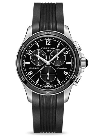 2. Модель «Certina DS First Lady Ceramic – Chronograph» C030.217.17.057.00 Стальной корпус, плоский безель из чёрной керамики, чёрный циферблат, центральные стрелки, стрелки счётчиков хронографа, условные индексы и арабские цифры белого цвета, каучуковый ремешок чёрного цвета. | |