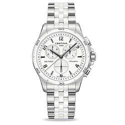 3. Модель «Certina DS First Lady Ceramic – Chronograph» C030.217.11.017.00 Стальной корпус, плоский безель из белой керамики, белый циферблат, центральные стрелки, стрелки счётчиков хронографа, условные индексы и арабские цифры чёрного цвета, стальной браслет с центральными звеньями из белой керамики. | |