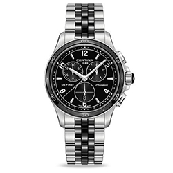 4. Модель «Certina DS First Lady Ceramic – Chronograph» C030.217.11.057.00 Стальной корпус, плоский безель из чёрной керамики, чёрный циферблат, центральные стрелки, стрелки счётчиков хронографа, условные индексы и арабские цифры белого цвета, стальной браслет с центральными звеньями из чёрной керамики. | |