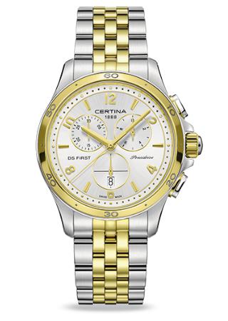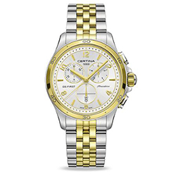 5. Модель «Certina DS First Lady Ceramic – Chronograph» C030.217.22.037.00 Стальной корпус, плоский керамический безель и заводная головка с PVD-покрытием жёлтым золотом, серебристый циферблат, центральные стрелки, стрелки счётчиков хронографа, условные индексы и арабские цифры с жёлтой PVD-позолотой, стальной браслет с центральными керамическими звеньями, также имеет PVD-покрытие жёлтым золотом. | |