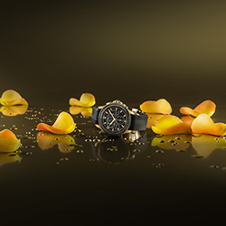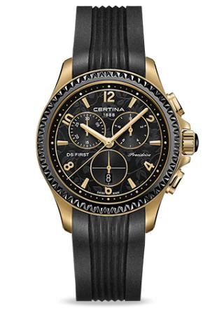7. Модель «Certina DS First Lady Ceramic – Chronograph» C030.217.37.057.00 Стальной корпус с PVD-покрытием розовым золотом, рифлёный безель из чёрной керамики, чёрный циферблат с цветочным узором, центральные стрелки, стрелки счётчиков хронографа, условные индексы и арабские цифры с розовой PVD-позолотой, каучуковый ремешок чёрного цвета. |
