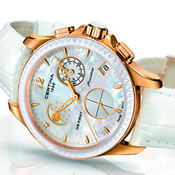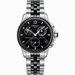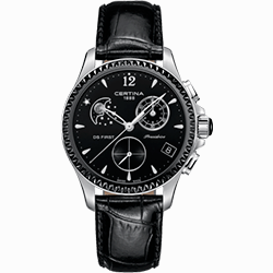 Часы Certina DS First Lady Chronograph Moon Phase представляют собой технически сложное изделие, при изготовлении которого были использованы высокотехнологичные материалы и детали высшего качества, современная технология «Precidrive ™», а также знаменитая фирменная система «Double Security». При всей этой сложности новый женский кварцевый хронограф с индикацией фаз Луны легко сочетает в своём дизайне спортивный стиль, элегантность, изящество и нотку роскоши, которой является небольшой бриллиант в оригинальной оправе на циферблате.