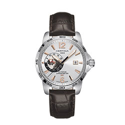 Часы DS Podium GMT Chronometer от CERTINA (диаметр 41 мм) в корпусе из нержавеющей стали с безелем с минутными отметками обеспечивают безграничные возможности измерения времени. Циферблат имеет серебряное напыление, PVD-покрытие из розового золота на стрелках, часовых отметках и указателе часового пояса. Всё это создает стильную комбинацию часов, которые сделают завершенным любой изысканный и элегантный образ. Модель для любителей путешествовать и космополитов дополнена коричневым ремешком из телячьей кожи с тиснением под крокодиловую. Также в линейке представлены экземпляры с браслетом из нержавеющей стали (с черным, серым или синим циферблатом), модели в корпусе из титана и с браслетом из аналогичного материала. Все эти модели объединяет исключительная надежность, подтверждаемая двойной системой защиты «DS» (Double Security). Часы DS Podium GMT Chronometer от швейцарского бренда CERTINA – выбор настоящих путешественников во времени и пространстве.