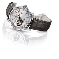 На отметке «9 часов» расположен отдельный 24-часовой указатель, позволяющий одновременно следить за временем в домашнем часовом поясе и в любом другом городе мира. Дополнительный циферблат визуально напоминает глобус, который развернут стороной Северного полюса. Ярко-красная стрелка и сегменты контрастных цветов указывают на дневное и ночное время, обеспечивают идеальную считываемость показаний. Точность хода кварцевого калибра Precidrive сертифицирована всемирно известной организацией Official Swiss Chronometer Testing Institute (COSC).