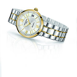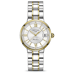 6. Модель C031.210.22.116.00 Стальной корпус и стальной браслет в стиле «биколор» с частичным PVD-покрытием жёлтым золотом, серебристый циферблат с отделкой гильоше и перламутровым цифровым полем; стрелки, римские цифры и условные индексы золотистого цвета, двенадцать бриллиантов, окошко даты. |